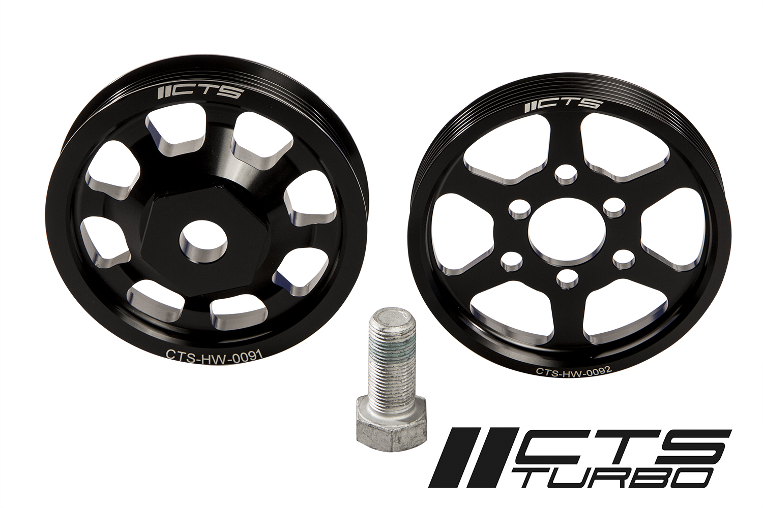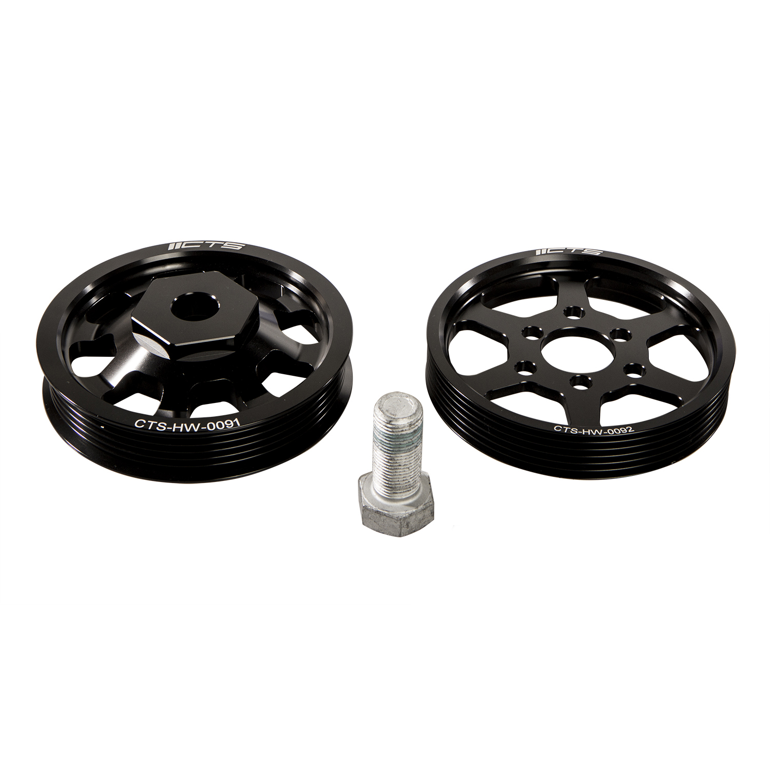The CTS Turbo crank pulley and power steering pulley are lightened to reduce parasitic drag on the engine. This results in faster revving and more horsepower. Included in the kit is the lightened crank pulley, lightened power steering pulley, and replacement bolt. The pulleys are made from T6 6061 aircraft grade aluminum and hard anodized to reduce wear. Gains of 5-7 horsepower can be expected.